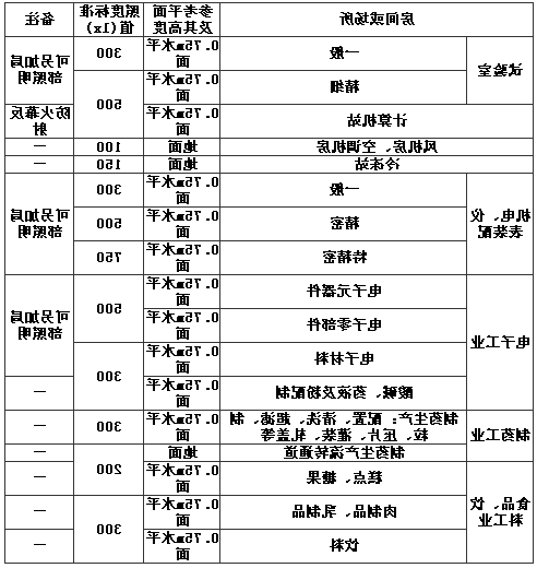 表11中的电子工业、制药工业、精密加工、食品工业等的照度值均在本条规定的200lx~500lx范围。本次修订本条改为推荐性条文。