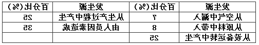 4.3.1、4.3.2 人员与物料进入洁净室会把外部污染物带入室内,特别是人员本身就是一个重要的污染源,不同衣着、不同动作时的人体产尘量见表5。从表5中数据可见,身着普通服装的人走动时的产尘(大于或等于0.5μm)量可达近300×104pc/(min·人)。根据国外有关资料报道,洁净室中的灰尘来源分析见表6,来源于人员因素的占35%。对洁净室空气抽样分析也发现,主要的污染物有人的皮肤微屑、衣服织物的纤维与室外大气中同样性质的微粒。由此可见,要获得生产环境所需要的空气洁净度,人员与物料的净化是十分必要的。