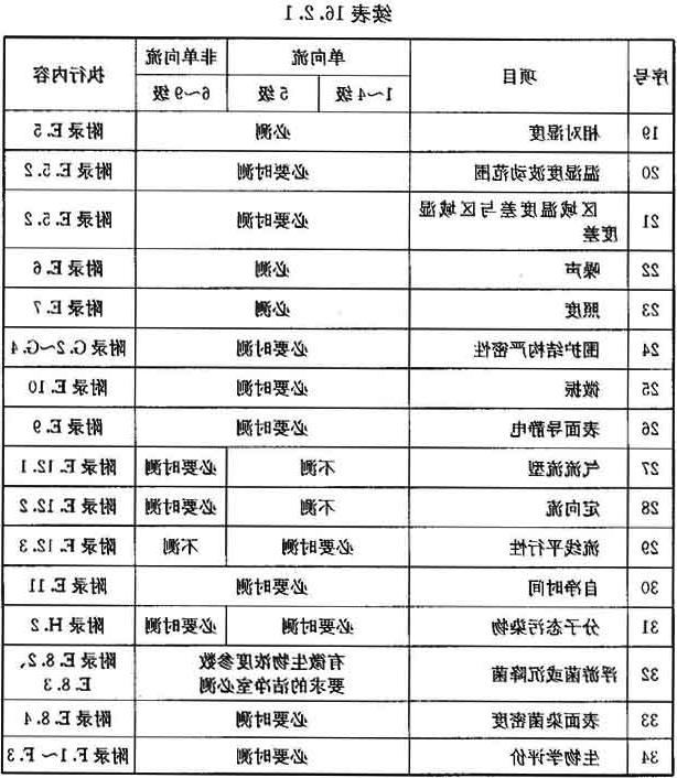 16.2.1 洁净室在高效过滤器现场检漏后的必测项目,应符合表16.2.1的要求,也可由该表选择选测项目。