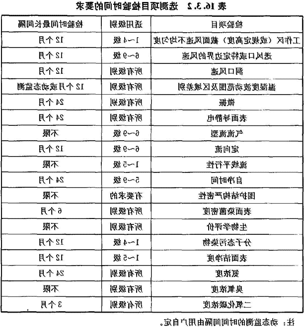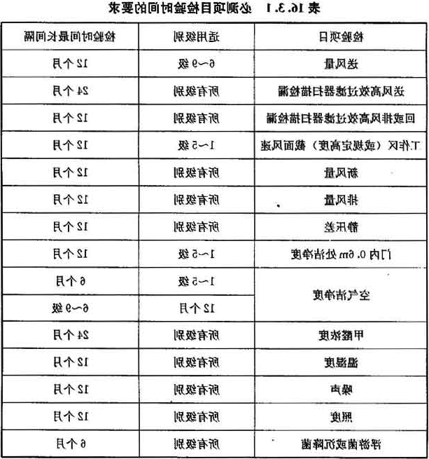 16.3.2 在工程验收后为确认洁净室的选测项目符合要求的日常检验(不含临时抽测)周期可按表16.3.2确定。