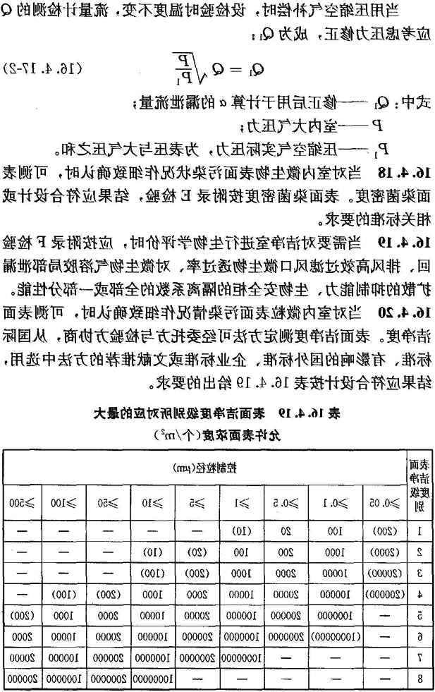 16.4.17 当对洁净室的严密性有特殊要求时,可测其围护结构严密性。围护结构严密性按附录G检验。检验结果应符合设计要求。当设计无明确要求时,可在以下两表的任何一种评定方法中任选一种方法,两表中最大测试压力设定为500Pa。