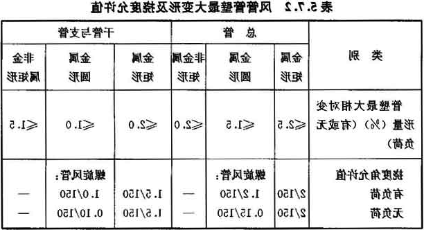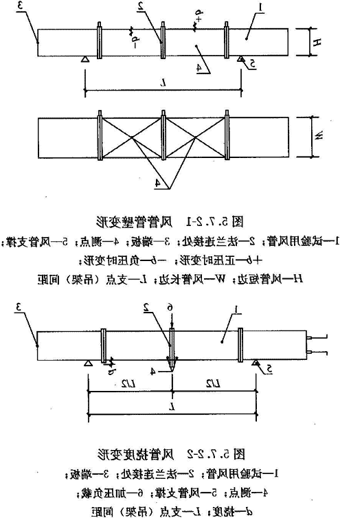 10 外购成品风管应有变形试验。风管管壁最大变形相对量(表面最大不平度b与风管短边长度H之比,图5.7.2—1)及挠度角允许值[两段风管组合件中央连接法兰部位的挠度量d与该两风管组合的两吊架(支点)间距一半L/2之比,见图5.7.2—2]应符合表5.7.2的规定。