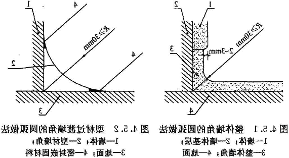4.5.1 地面与墙面的夹角应为曲率半径只不小于30mm的圆角。当用柔性材料粘贴地面时,在墙面上应延伸至地面以上形成圆角并与墙面平齐,或略缩进2mm~3mm,突出的墙面应圆滑过渡(图4.5.1)。需经常冲刷的地面,地面材料在墙面上延伸高度应大于150mm。