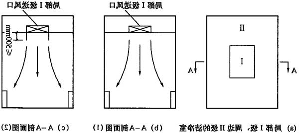 7.2.5 根据扩大主流区原理,当送风口集中布置时,由于降低了不均匀分布系数,因而提高了洁净度,大约集中面积占室面积1/16时,集中区可达到ISO 5级,周边区可达到ISO 7级,现取1/14,更安全一些。如图5所示,当