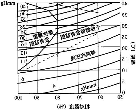 6.2.7、6.2.8 本节对围护结构内表面抗菌涂饰工程进行了规定,由于在食品工业用房内使用抗菌涂饰工程目前在国内外意见不太统一,担心抗菌产品会使食品中产生抗药性菌株,但对于湿度经常超过75%或有蒸汽作业的房间或关键区域的抗菌防霉问题,目前仍没有更好的解决办法,内表面抗菌有很多方法,如消毒,但本规范仅对使用抗菌涂料的情况进行了规定。当相对湿度达到80%时,不论温度高低,基本上都要发霉,见图4,所以此时可涂防霉涂料。