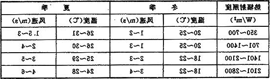 注:1 轻劳动时,温度宜采用表中较高值,风速宜采用较低值;重劳动时,温度宜采用较低值,风速宜采用较高值,中劳动时,其数据可按插入法确定。